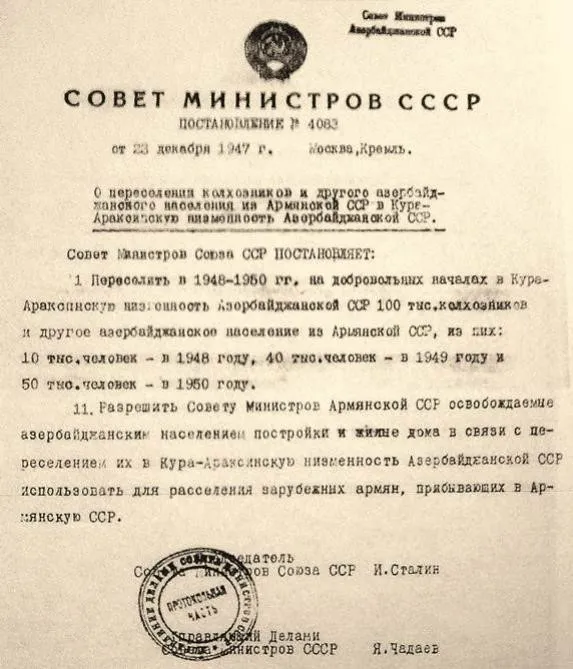 Çalışmalar, SSCB hükümetinin 1948-1953 yılları arasında Türkleri günümüz Ermenistan'ındaki tarihi ve etnik topraklarından sürgün etme kararının büyük ölçüde uygulandığını göstermektedir. Bu karar, Ermenistan'ın 23 bölgesinden 100.000 Azerbaycanlının gönüllü olarak yeniden yerleştirilmesini öngörmesine rağmen, gerçekte şiddet yoluyla uygulanmış ve yaklaşık 150.000 Azerbaycanlı 24 bölgeden ve Erivan şehrinden (200 yerleşim yeri) sürgün edilmiştir.