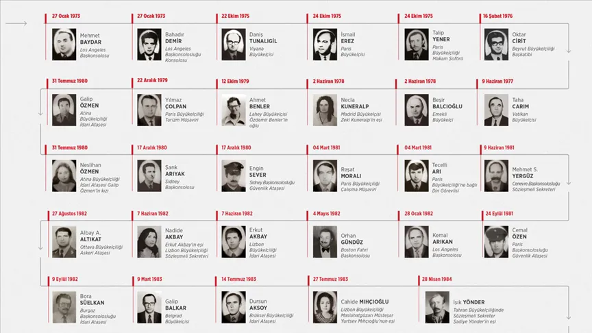Bu kapsamda, ilk olarak 1973 yılında Los Angeles Başkonsolosumuz Mehmet Baydar ile Konsolosumuz Bahadır Demir bir Ermeni terörist tarafından şehit edilmişlerdir. Akabinde 22 Ekim 1975 tarihinde Viyana Büyükelçimiz Daniş Tunalıgil’in şehadeti ile devam eden Ermeni terör örgütleri iltisaklı saldırılar neticesinde 58’i Türk vatandaşı olmak üzere (31’i diplomat ve aile mensubu) 77 kişi hayatını kaybetmiş, çok sayıda kişi yaralanmıştır.