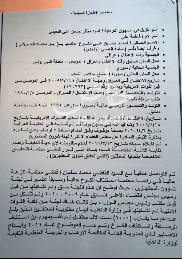 -تم إخلاء سبيله بتاريخ 2011/12/31 لعدم مطلوبية لأي جهة تحقيقية وعدم كفاية الأدلة المتحصلة ضده، بناءً على قرار قاضي محكمة التحقيق المختصة بقضايا المعتقلين (قاضي تحقيق شؤون المحتجزين)