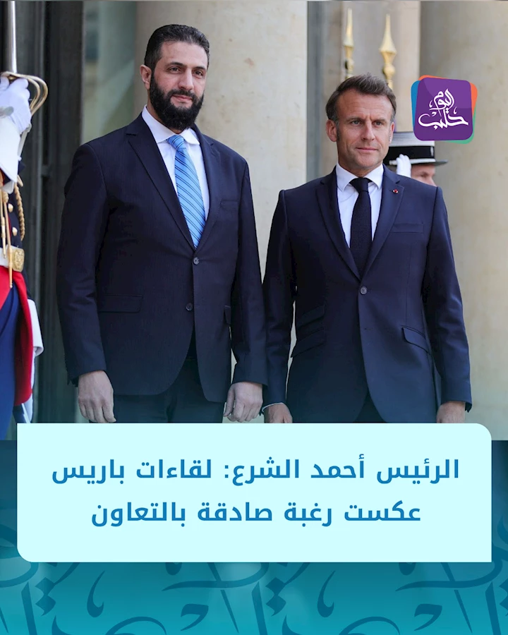 وأضاف الشرع أن حكومته تعمل على طيّ صفحة الاستبداد ومداواة الجراح من خلال مشروع وطني لإعادة الإعمار، قائم على مفاهيم العدالة والمساءلة، لافتًا إلى أن سلامة السوريين تمثل أولوية قصوى للقيادة الجديدة في دمشق. كما أشار إلى أن حكومته تخوض مفاوضات غير مباشرة عبر وسطاء مع إسرائيل لتهدئة الوضع على الحدود، كما ناقش مع ماكرون استمرار الهجمات الإسرائيلية والوضع المعقّد في جنوب لبنان