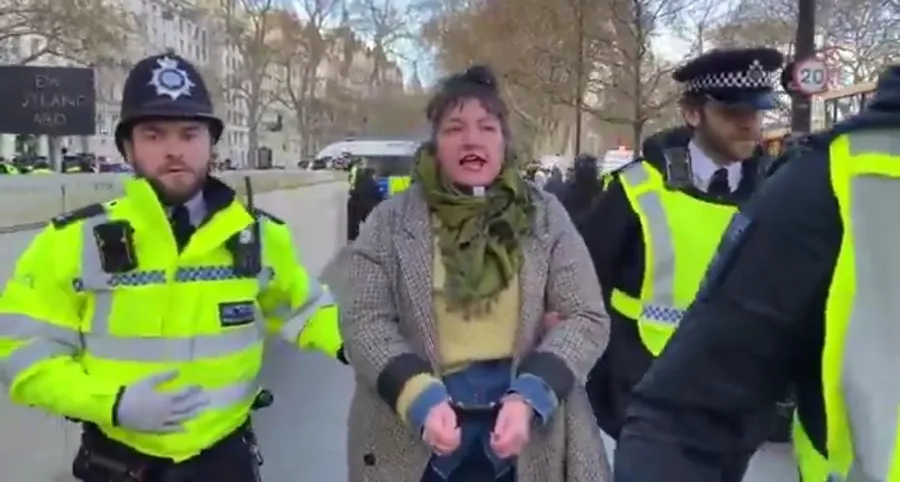 İngiltere’nin başkenti Londra’da düzenlenen protestolarda dikkat çeken bir olay yaşandı. Bir protestocu, yalnızca kartondan pankart taşıdığı gerekçesiyle gözaltına alındığını belirterek, hükümeti sert sözlerle eleştirdi.