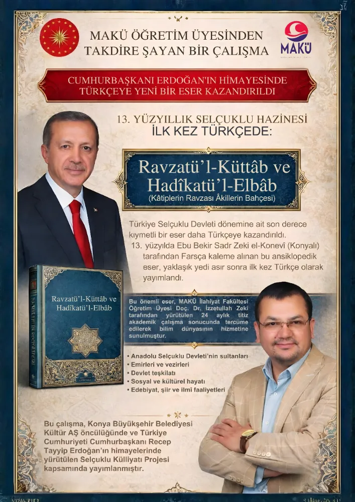 Cumhurbaşkanı Recep Tayyip Erdoğan’ın himayelerinde yürütülen Selçuklu Külliyatı Projesi kapsamında, Türkiye Selçuklu Devleti dönemine ait son derece kıymetli bir eser daha Türkçeye kazandırıldı. 13. yüzyılda Konya’da yaşayan Ebû Bekir Sadr Zeki el-Konevî tarafından Farsça kaleme alınan Ravzatü’l-Küttâb ve Hadîkatü’l-Elbâb, yaklaşık yedi asır sonra ilk kez tam bir şekilde Türkçe olarak yayımlandı.