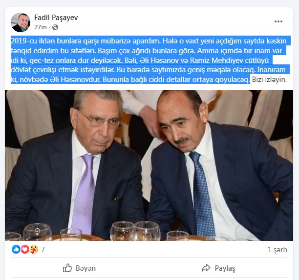 Gazeteci Fadıl Paşayev, yıllar önce bazı kişilere karşı verdiği mücadeleyi Facebook hesabından şöyle yazdı: "2019'dan beri onlarla mücadele ediyorum. O zamanlar bile, yeni açtığım web sitesinde bu kişileri sert bir şekilde eleştiriyor, çok acı çekiyordum. Ama er ya da geç 'dur' deneceğine inanıyordum. Evet, Ali Hasanov ve Ramiz Mehdiyev çifti darbe yapmak istiyordu."