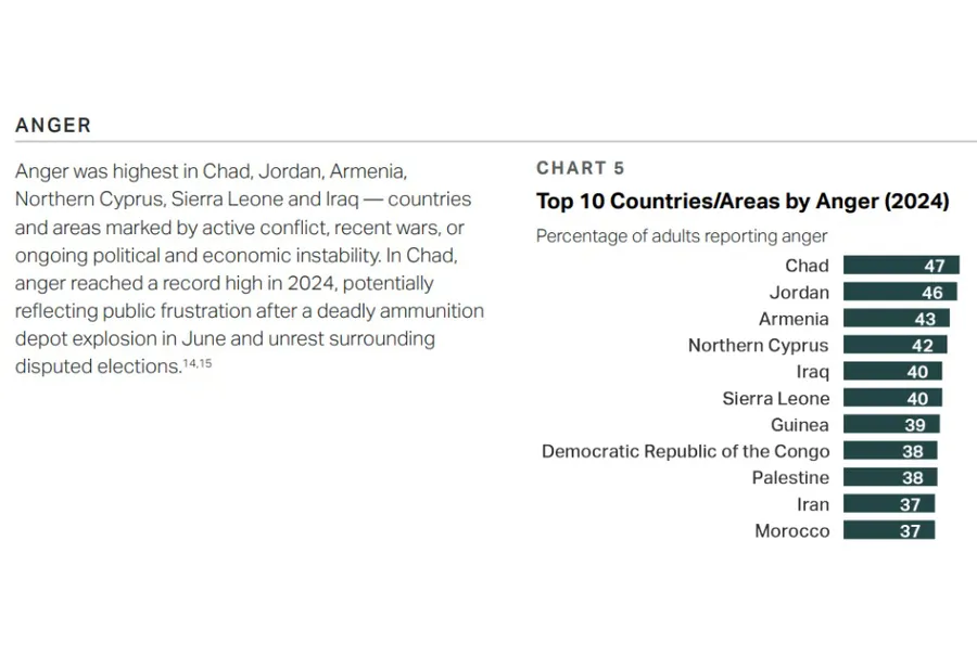 2024 yılına ait verileri sunan çalışmada, "Öfke düzeyleri en çok Çad, Ürdün, Ermenistan, Kuzey Kıbrıs, Sierra Leone ve Irak'ta görüldü. Bu ülkeler ve bölgeler aktif çatışma, yakın zamanda yaşanan savaşlar veya devam eden siyasi ve ekonomik istikrarsızlık yaşıyor." denildi.