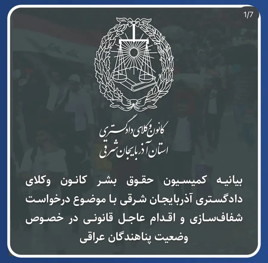 “Doğu Azerbaycan Barosu İnsan Hakları Komisyonu, İsrail’in ülke topraklarına saldırısını kınamak ve ordunun direncini takdir etmekle birlikte, özellikle Batı İran’da ve Batı Azerbaycan’da bulunan Iraklı mültecilerin durumu ile ilgili olarak şeffaflık sağlanmasını, yetkililerin dikkatli hareket etmesini ve gerekli önlemlerin alınmasını vurgular.
