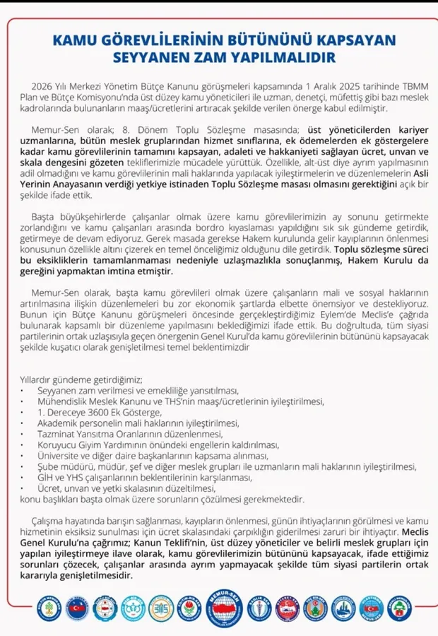 Bütçe Kanunu görüşmeleri yaklaşırken kamu görevlilerini temsil eden sendikalar, Meclis’e güçlü bir çağrı yaparak seyyanen zammın tüm çalışanları kapsayacak şekilde genişletilmesini istedi. Yapılan açıklamada, siyasi partilerin ortak uzlaşıyla komisyondan geçen önergenin Genel Kurul’da “kuşatıcı bir düzenlemeye dönüştürülmesinin” temel beklenti olduğu vurgulandı.