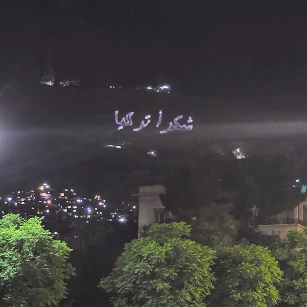 Suriye’nin başkenti Şam’da bulunan Kasyun Dağı, dün gece dikkat çeken bir görüntüye sahne oldu. Dağın yüzeyine dev harflerle “Teşekkürler Türkiye” yazısı yansıtıldı. Görsel şölen sosyal medyada kısa sürede büyük yankı uyandırırken, Türkiye'nin bölgedeki insani yardımları ve diplomatik girişimlerine duyulan memnuniyetin bir göstergesi olarak yorumlandı.