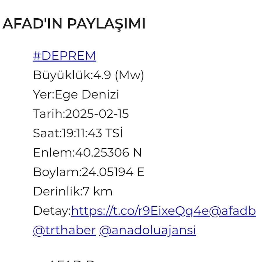 Afet ve Acil Yönetim Başkanlığı (AFAD), Ege Denizi'nde 4.9 büyüklüğünde deprem meydana geldiğini açıkladı.