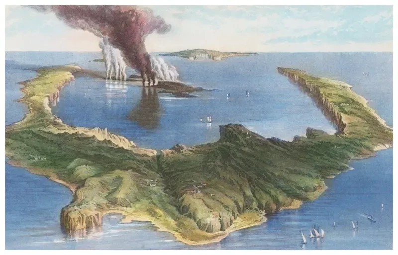 Ortasında yanardağ bulunan yuvarlak Santorini Adası'nın büyük kısmı patlamanın etkisiyle sular altında kalıyor.