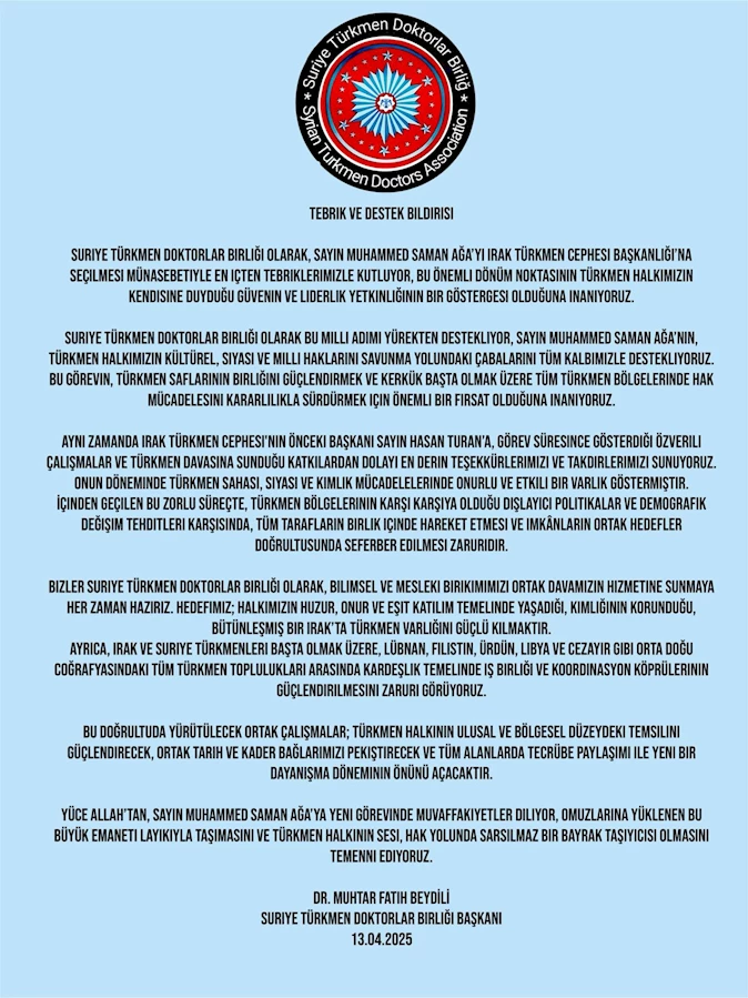 Suriye Türkmen Doktorlar Birliği olarak bu milli adımı yürekten destekliyor, Sayın Muhammed Saman Ağa’nın, Türkmen halkımızın kültürel, siyasi ve milli haklarını savunma yolundaki çabalarını tüm kalbimizle destekliyoruz. Bu görevin, Türkmen saflarının birliğini güçlendirmek ve Kerkük başta olmak üzere tüm Türkmen bölgelerinde hak mücadelesini kararlılıkla sürdürmek için önemli bir fırsat olduğuna inanıyoruz.