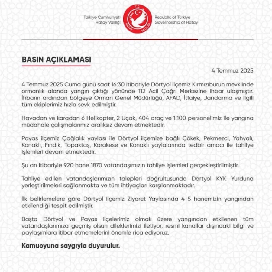 Hatay Valiliği, gelişmelerin yakından takip edildiğini ve kamuoyunun resmi açıklamalar dışında yapılan paylaşımlara itibar etmemesi gerektiğini hatırlattı.
