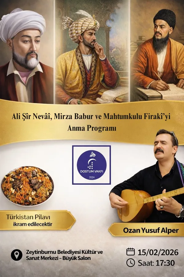 Türk dünyasının üç büyük ismi; Ali Şîr Nevâî, Zahîrüddîn Muhammed Bâbür ve Mahdum Kulu, 15 Şubat 2026 tarihinde İstanbul’da düzenlenen anlamlı bir programla anıldı. Dostum Vakfı tarafından gerçekleştirilen etkinlikte, özellikle Güney Türkistan’ın dil ve kültür mirasına yapılan katkılar ile Afganistan Türklerinin güncel meseleleri gündeme taşındı.