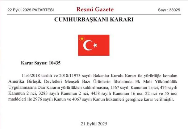 Türkiye, 2018 yılından bu yana ABD’den ithal edilen bazı ürünlerde uygulanan ek gümrük vergilerini kaldırma kararı aldı. Karar, Resmî Gazete’de yayımlanarak yürürlüğe girdi.