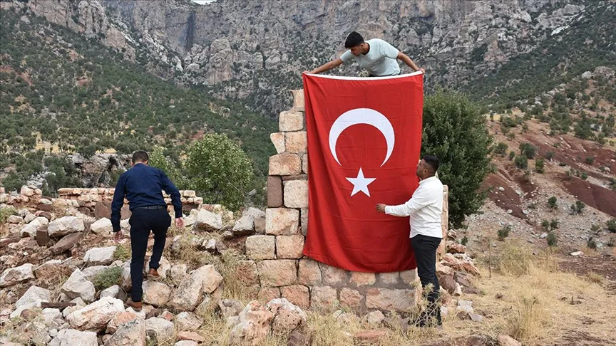 Şirnak Güneyce köyü Berman mezrasında 21 Eylül 1987'de PKK'lı teröristlerin saldırısında yakınlarını kaybedenler, katliamın yıl dönümünde Türk bayrağı asmışlardı geçen sene @anadoluajansi fotosudur.