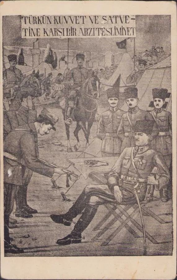 Buyük Taarruz sonrası esir alınan Yunan komutanı Trikopis, Atatürk'e artık esirinim diyerek kılıcını teslim ediyor.